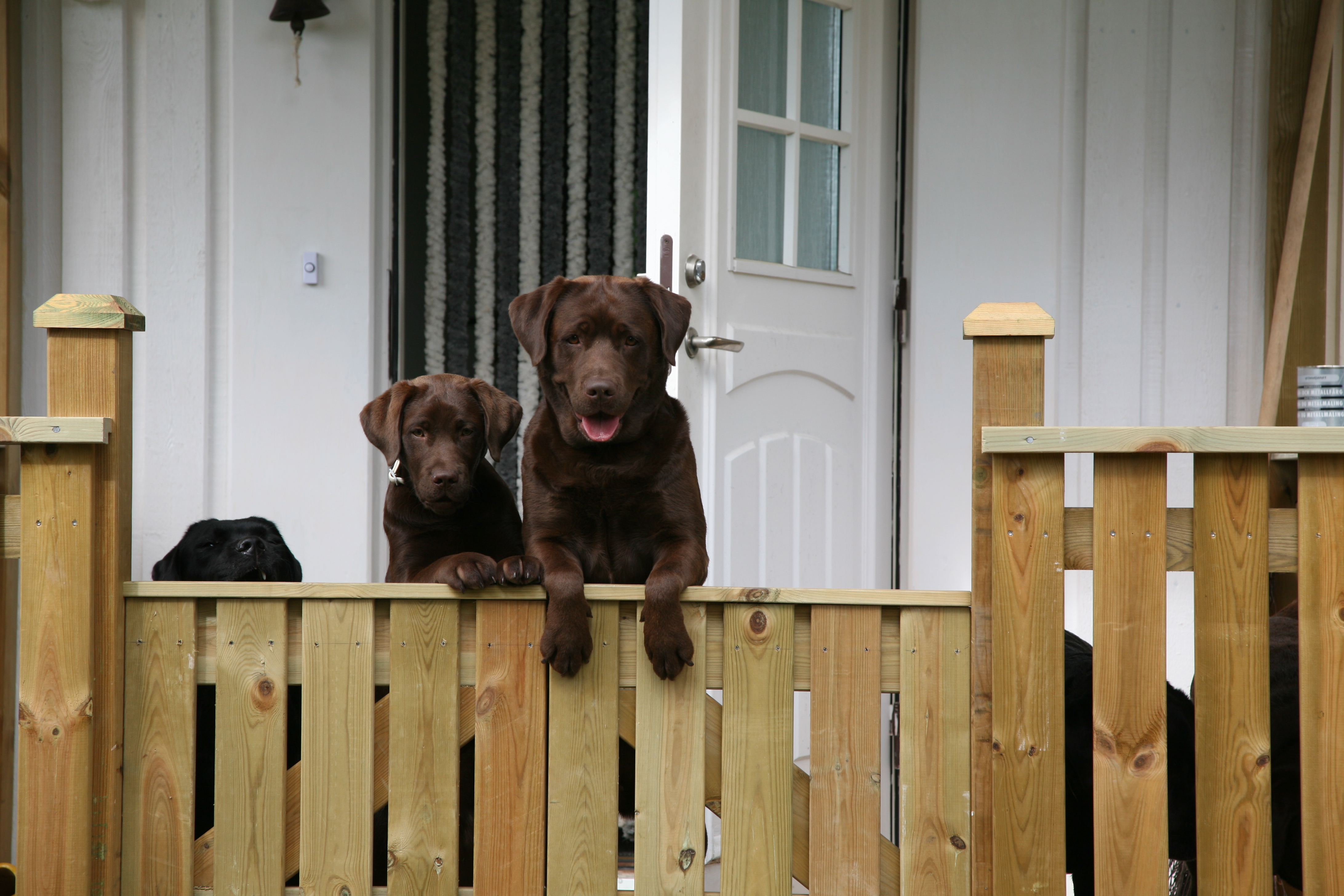 klein ding is er altijd wel wat te beleven toch! Vandaag zijn Lise en ik weer naar puppencursus geweest en ze deed prima haar best, nu moet ik alleen wat meer trainen op het liggen en ja het blijven, ik heb daar zelf nog niet veel aangedaan en zal daar aan moeten werken nu. Lise blaft vrij veel zeker als we op cursus zijn en ze mijn aandacht wil en die dan eventjes niet krijgt, ja Britta blaft ook veel maar die blaft meer uit waakzaamheid. 😉 Bij onze voordeur hebben we een kleine verandra gemaakt en daar twee deurtjes voor zodat de honden daar zonder probleem kunnen liggen of kijken wat er allemaal gebeurd, ik heb een paar foto’tjes gemaakt als ze nieuwsgierig over het hekje kijken!
